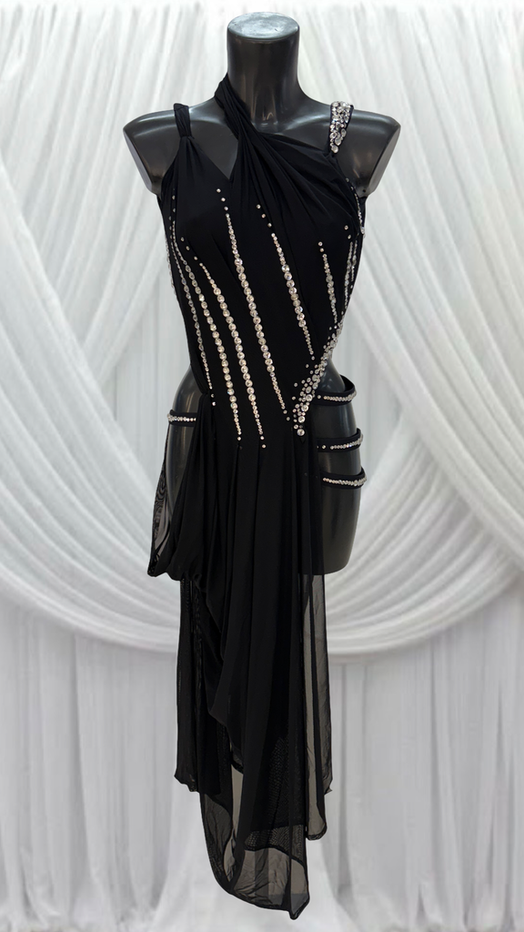 BLACK BODYSUIT WITH BLACK MESH DRAPE AND CRYSTAL DETAIL.